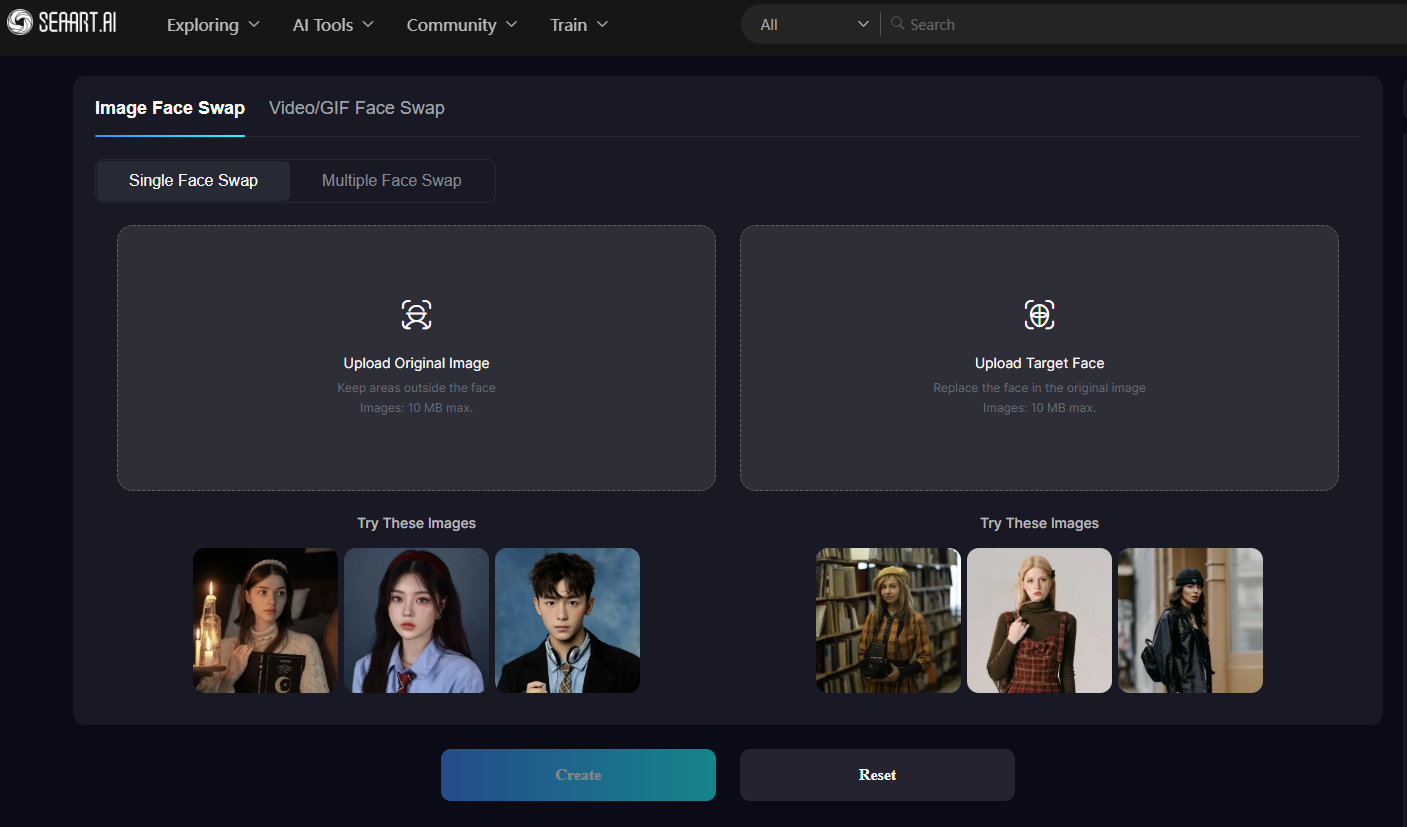 SeaArt AI integrates smart technology algorithms to accurately perform face swaps instantly. This particular option contains several features, including image face swap, GIF/video face swap, celebrity face swap, meme face swap, and gender swap. SeaArt AI promises quick results that look natural and realistic without manual adjustments.